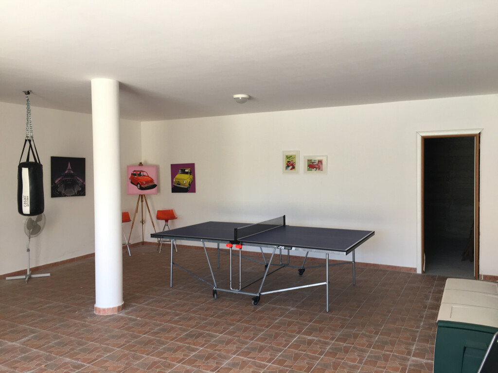 - Stor garage, hvor der er tennisudstyr, bordtennis, træningsudstyr og andet legetøj til afbenyttelse